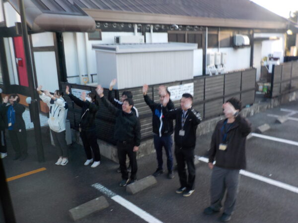 6時50分。たくさんの先生方や保護者の皆さんが見送る中、ついに出発です。