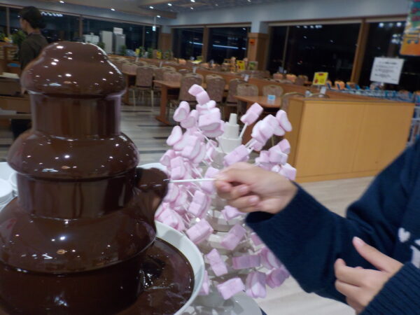 チョコレートが流れ落ちる夢の空間です。本気で食べる子供たち。