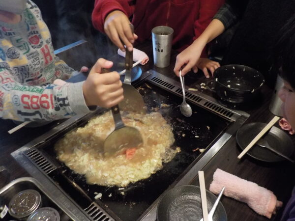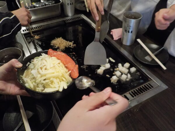 昼食はもんじゃ焼き。作り方を教わりながらみんなで作ります。