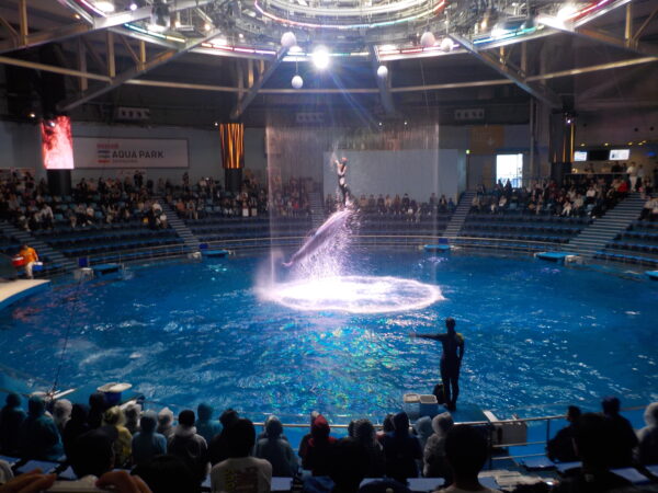 最後の目的地はアクアパーク品川。水族館です。魚やショーはもちろんですが、働く人にも注目します。水しぶきでずぶぬれになるのも良い思い出です。