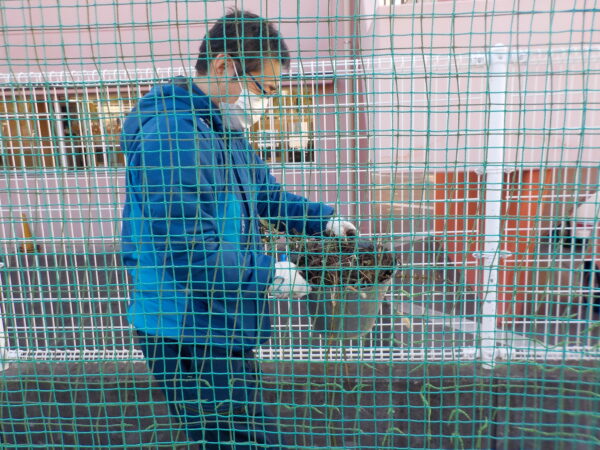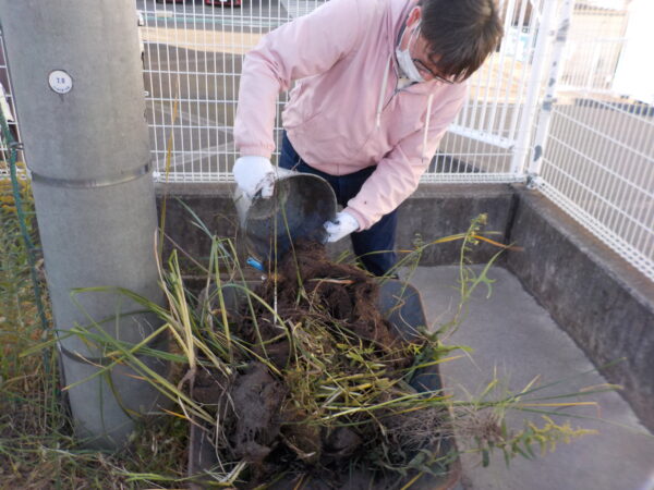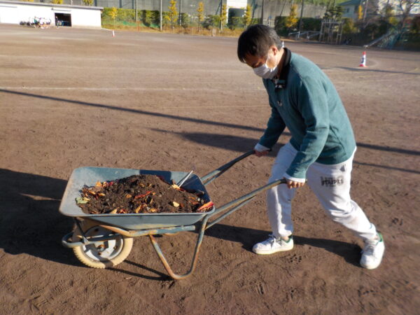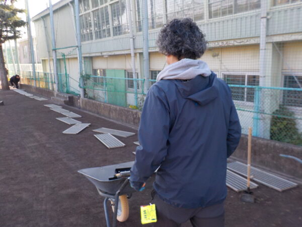 ネット裏は一輪車が入れないのでバケツリレーです。